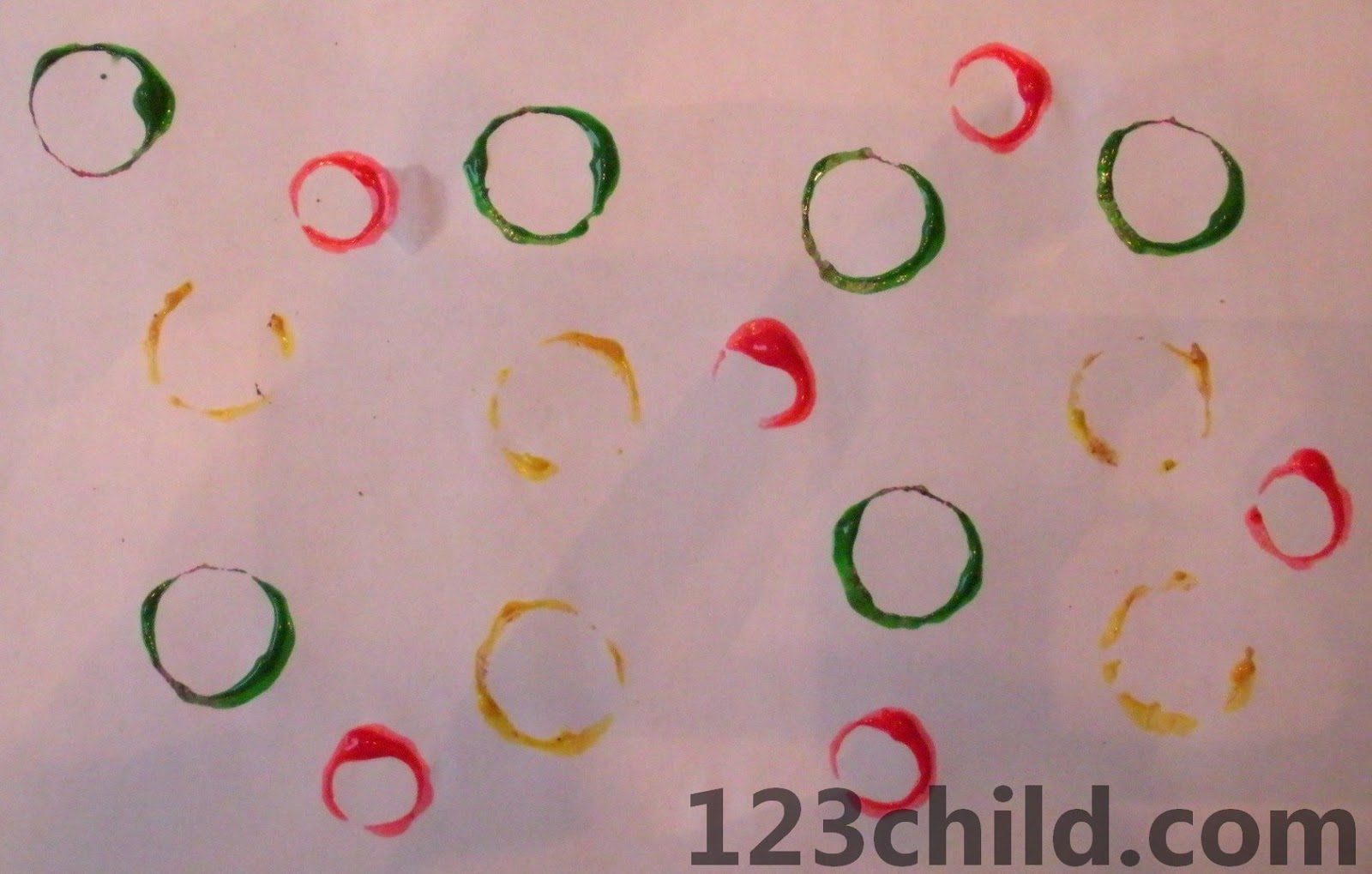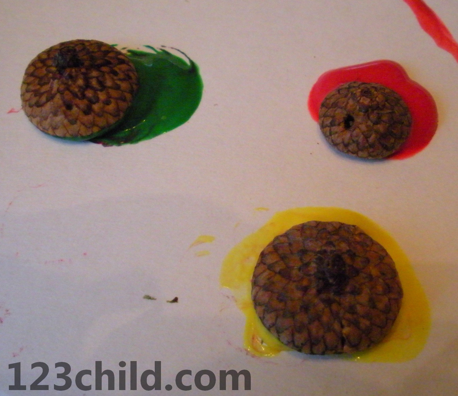 Have your child press the lid of an acorn onto a stamp pad them firmly onto a piece of paper. Make sure you use a new acorn lid for each color that you use.