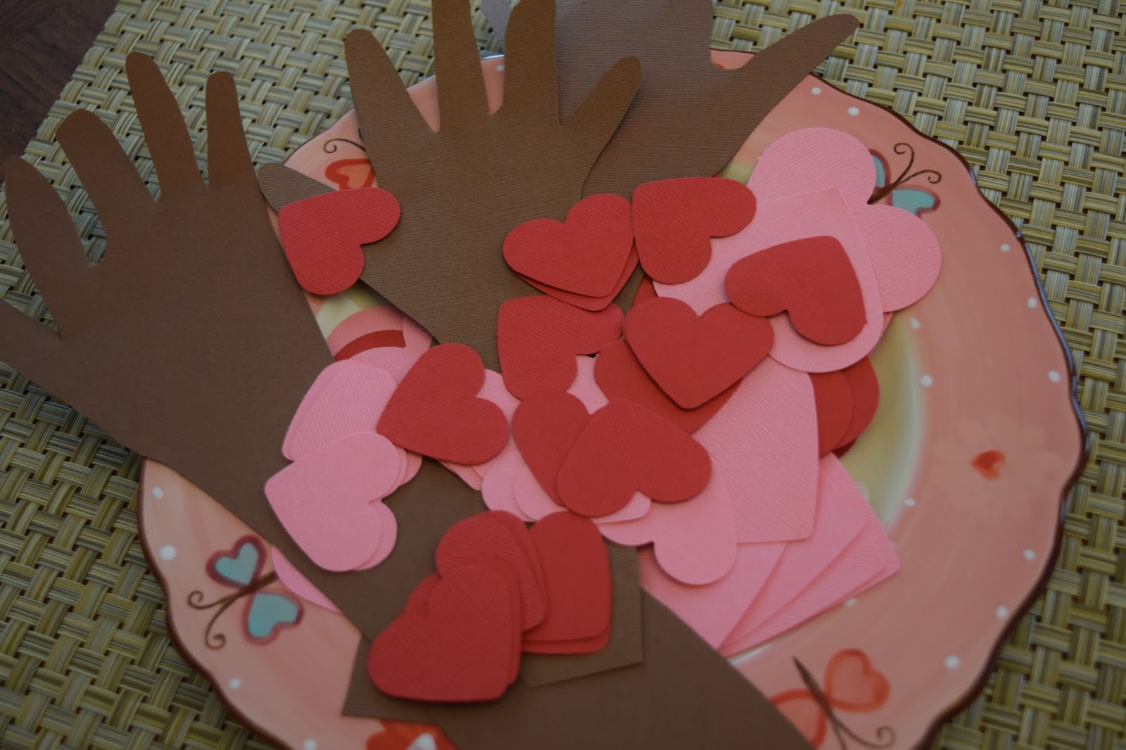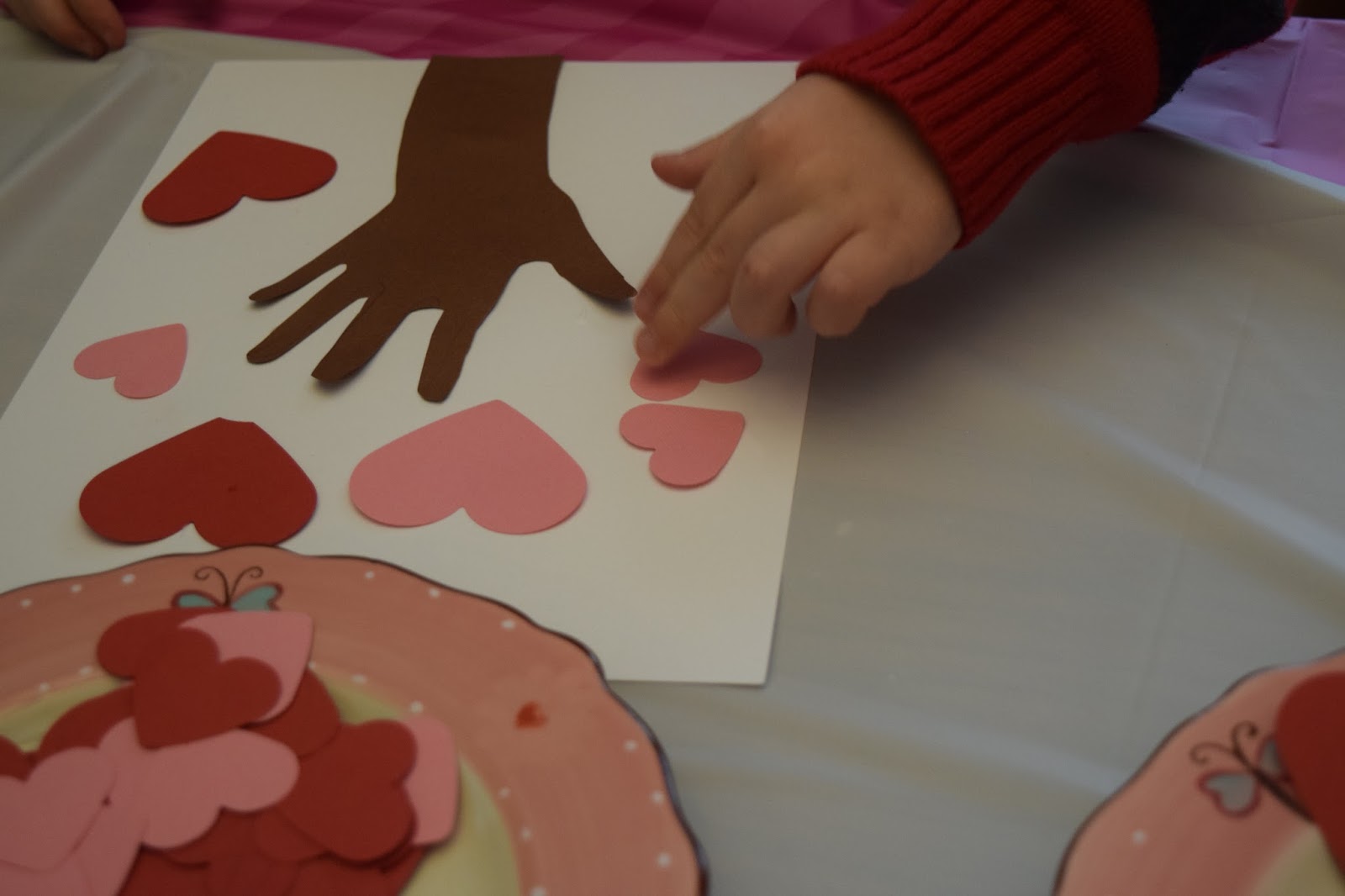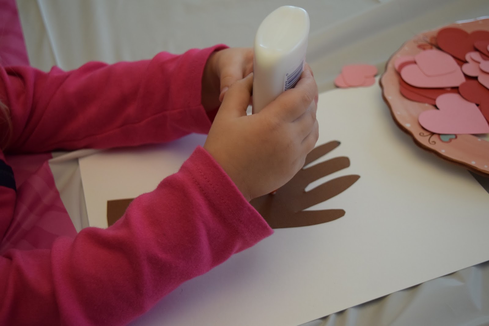Using the die, cut out hearts using red and pink paper. I used two different size die cuts. Older children could use stencils to trace and cut out their own hearts or even paint the hearts onto the paper. In this project, we just needed to glue the hearts.