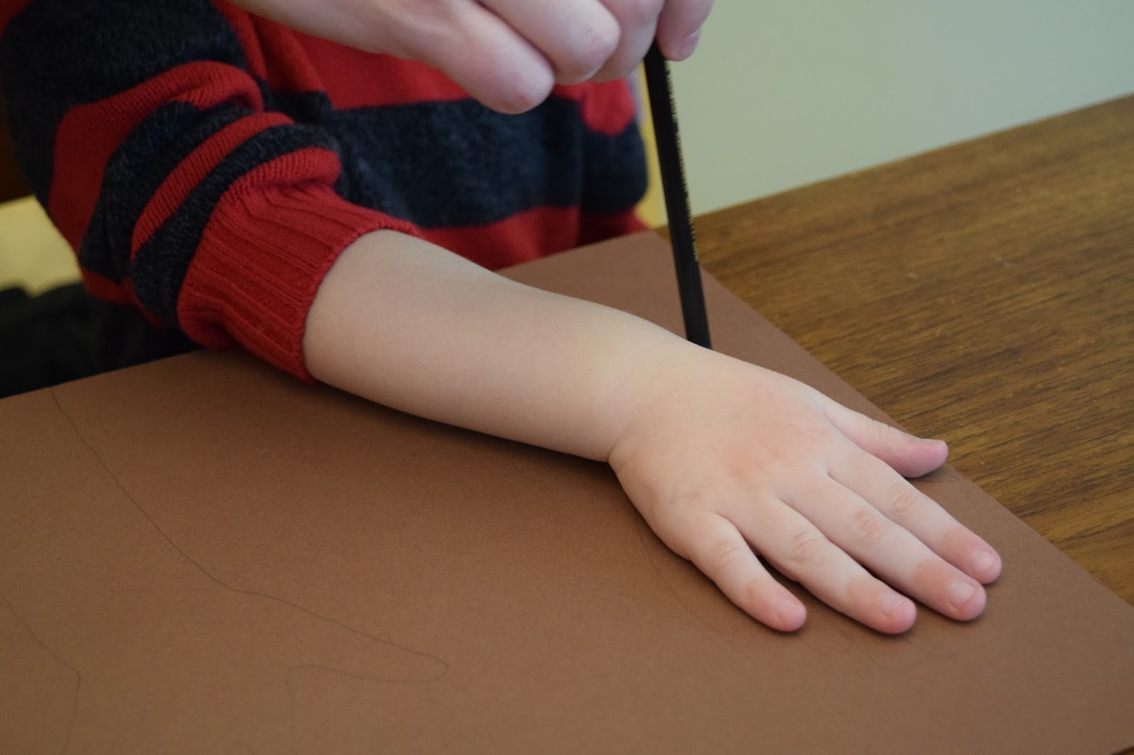 Trace your hand and a small portion of your arm onto brown paper.  This will become the tree trunk and branches.