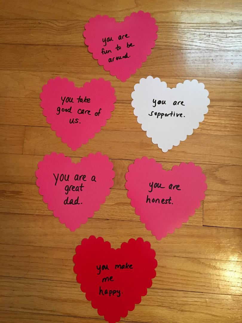 So starting February 1st I began to decorate the bedroom doors of my kids and my own bedroom door for my husband with hearts. Every day I added a heart. Statements like you are kind, you give good hugs, and you are helpful adorned our doors. Pointing out strengths like you are good at science or even silly things like you are cooler than Batman.