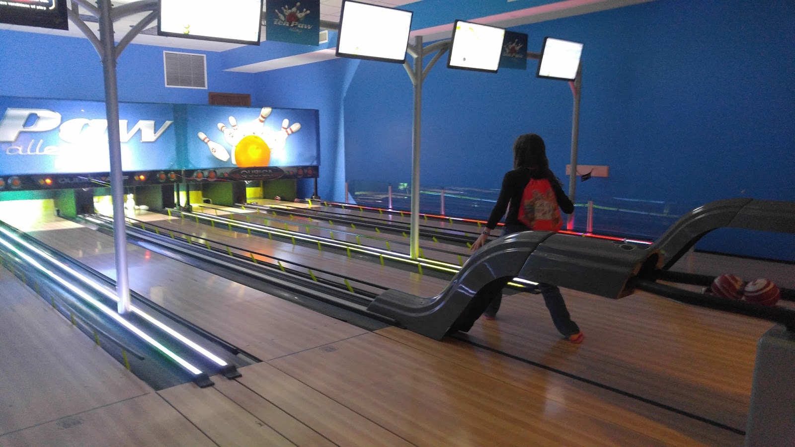 As mentioned earlier we used our 20 Paw Points for Northern Lights Arcade at Ten Paw Alley to go bowling. The alley is a bit different. The half-length lanes, five-pound balls, and optional gutter bumpers make the game super easy for the little ones.
