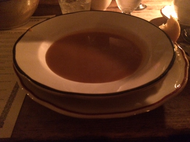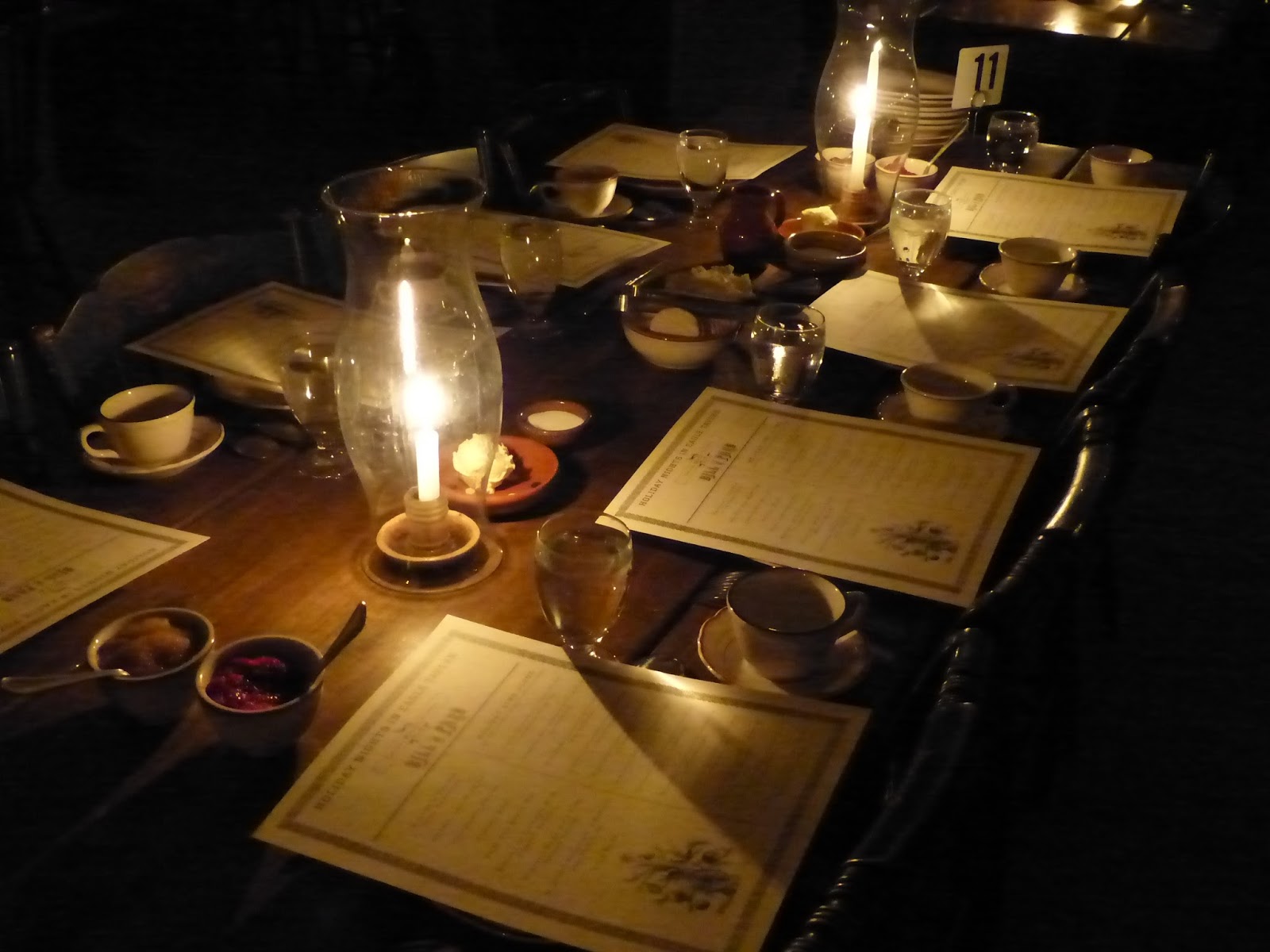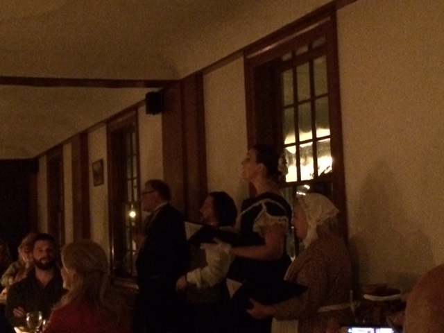 After everyone is seated, the supper bell is rung by a selected guest and the host introduces the food. From that point on, the food just seems to keep coming. Before the main entrees, guests are invited to try a bowl of squash soup. The servers scoop the soup from a large pan into bowls which are then passed to the ends of the table until all have been served. This is part of the authentic experience.