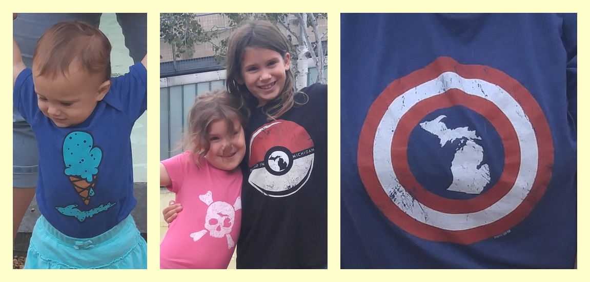The shirts are so adorable, and we had at least four people stop us to ask about them while were at the museum. Â See the Michigan in each shirt? Â My favorite is the Pokemon shirt… “Trained in Michigan”. Â Love it. Â I also LOVE the blue moon ice cream cone shaped like Michigan. Â All the shirts were true to size and fit the way I expected them to.
