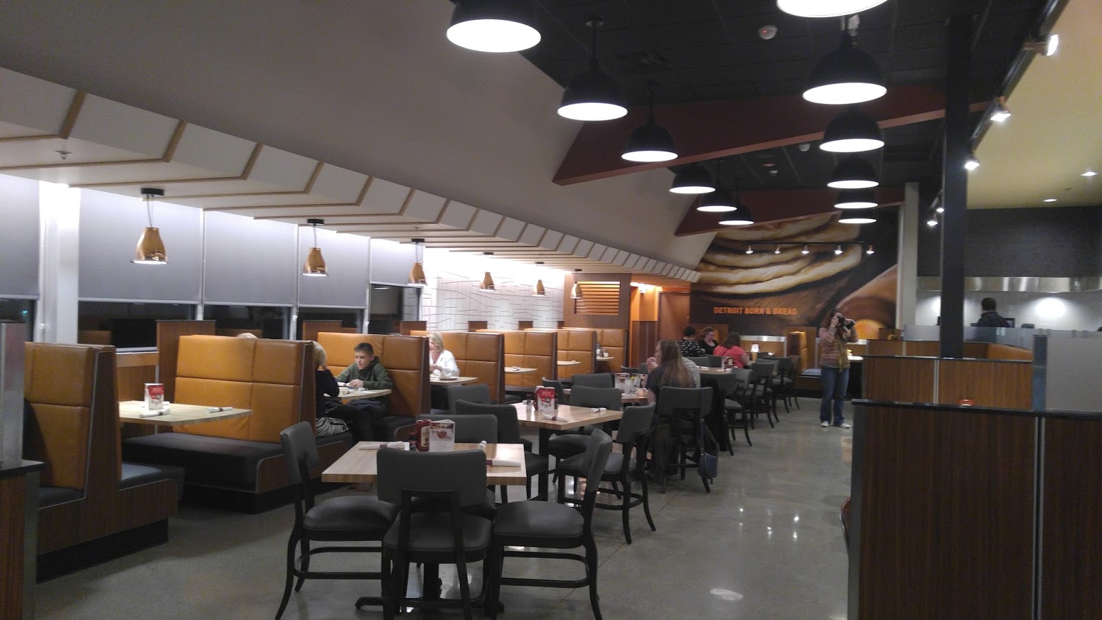 The retro style of the new restaurants uses the original Olga’s color palate with custom made wallpaper. How cool is that?